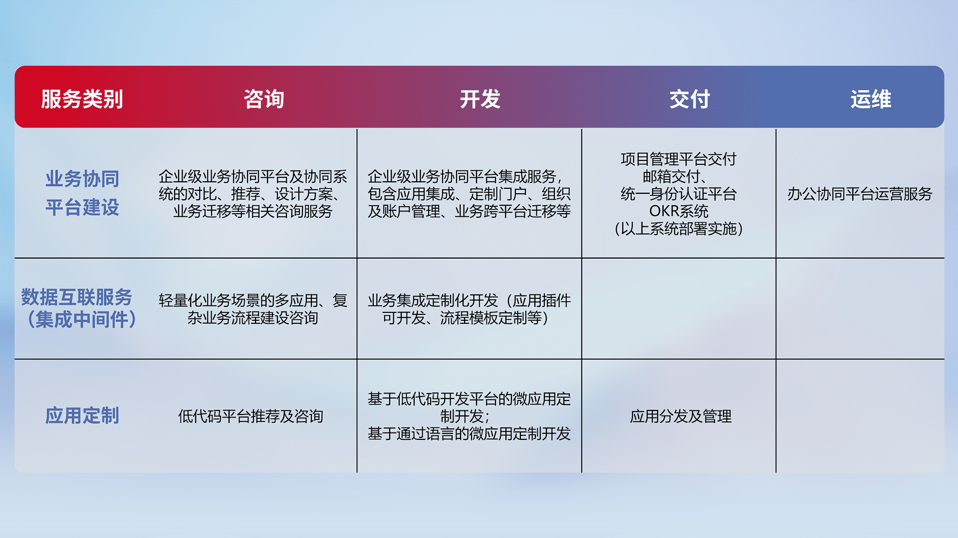 针对钉钉、、、企微、、、IDaas等平台级产品提供产品的规划、、、方案、、、、交付、、定制化开发等服务,,,,实现如统一协同办公、、、、智能客户服务、、、混合会议管理、、智能数据查询、、、等业务场景,,,,实现数字化转型。。。