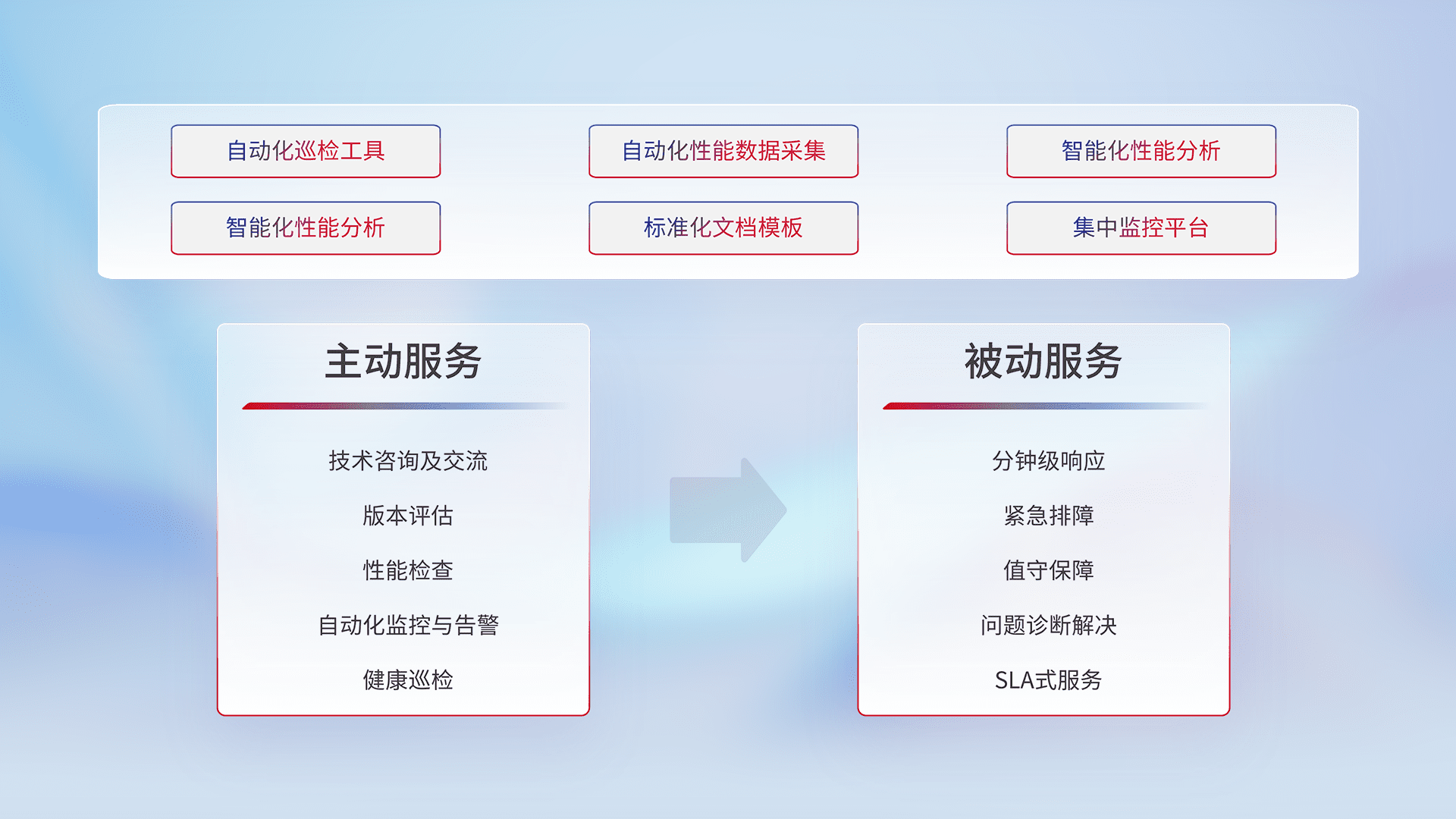 智能化工具和标准化文档,,,保障服务质量,,,提供主动服务(包含技术咨询、、版本评估、、、、性能检查、、、自动化监控与告警、、、健康巡检)和被动服务包含(分钟级响应、、紧急排障、、值守保障、、、问题诊断解决、、、SLA服务)。。